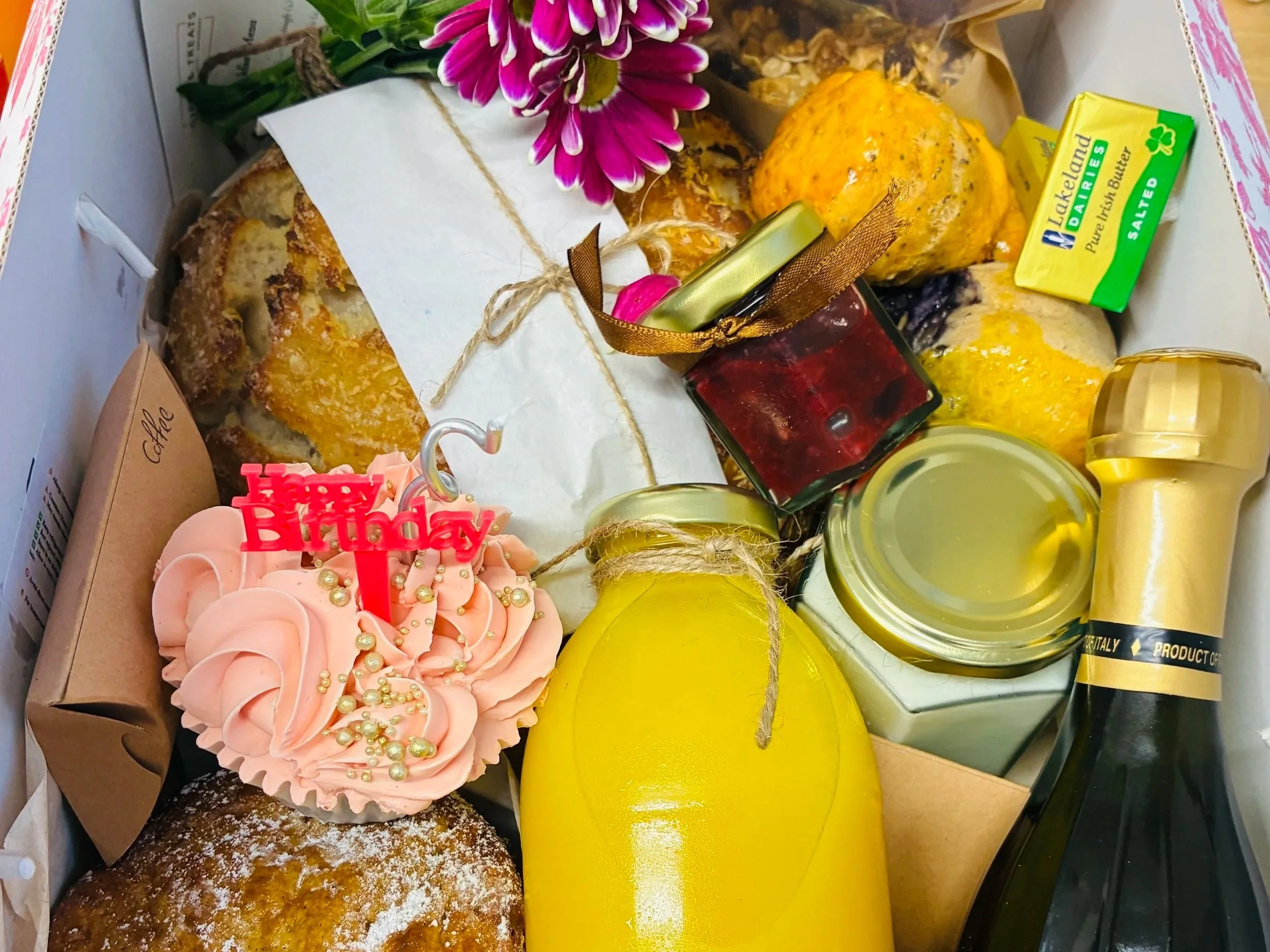 Our breakfast hampers feature a delightful selection of homemade, freshly baked goods, perfect for a delicious start to your day. Packed with care, each hamper includes a variety of pastries, breads, and treats made from the finest ingredients.